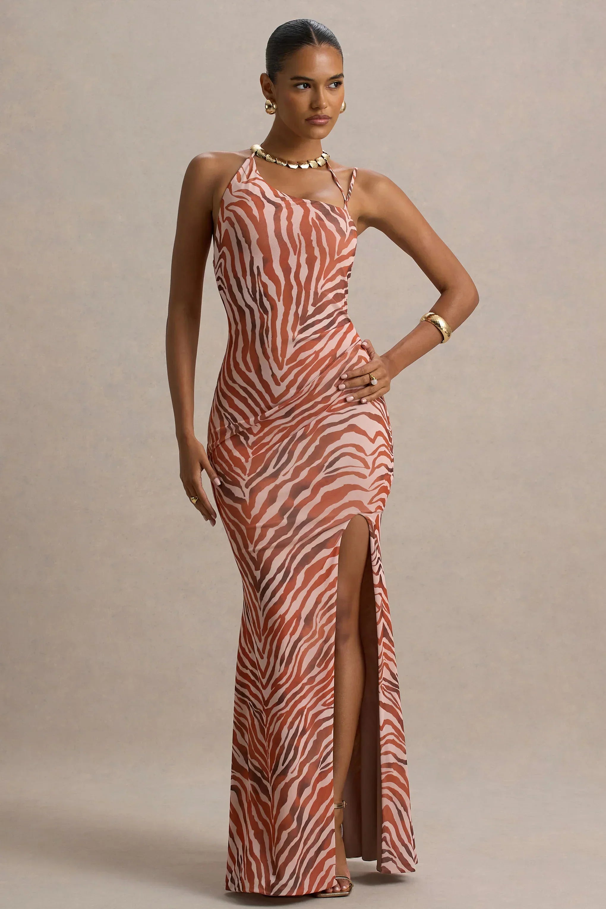 Make a statement in our striking Florica maxi. Designed from our premium mesh in an eye catching zebra print, in this maxi you will make an entrance. Featuring an asymmetric neckline that elegantly displays your decolletage and a front leg split that adds a daring edge. This piece will drape over your curves giving you a dreamy silhouette, from date night to girls nights out, in Florica you will exude glamour.